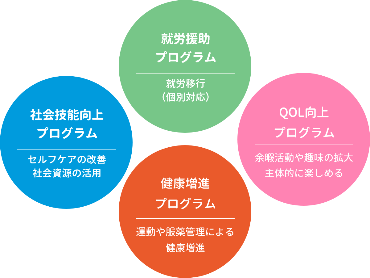 また、安定した生活を続けるために必要な知識を学んだり、就労に向けてステップアップをする準備期間として利用される方もおり、患者さま一人ひとりにとって必要な支援を行っています。
